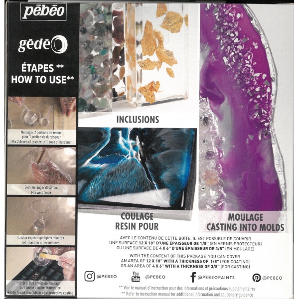 50% biosourced resin that is safer and more environmentally friendly. Transparent, gloss, bubble-free and easy to work with thanks to its two-component (resin A and hardener B) epoxy resin system. With its liquid texture, the resin is ideal for casting in moulds or framed media, inclusions and even as a protective varnish. Once dry, it is hard and non-porous. Easy to use with professional results. For experienced and amateur adult users.