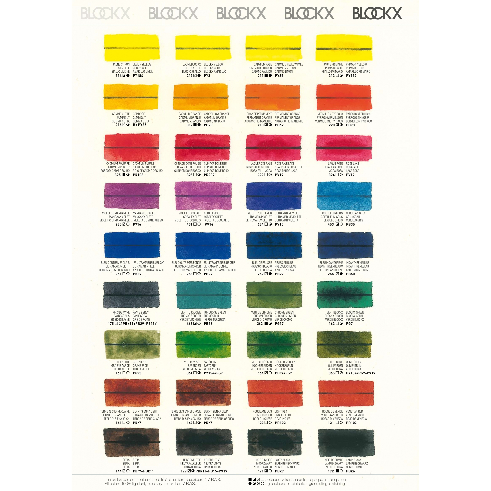 Only lightfast pigments to insure stability because watercolour is a naturally fragile medium. The most intense and brilliant pigments, which always can be diluted but never improved. A binding agent that facilitates the working properties. Made with the finest traditional ingredients but prepared with a modern formula for the needs of today's artists. Slowly ground on stone tricylinders to simulate the manual process and accentuate the individual quality of each color.