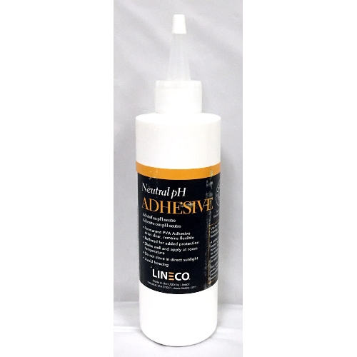 Lineco acid-free adhesive has excellent lay-flat properties and dries clear. Easy to use polyvinyl acetate (PVA) formula is fast setting and re-moistenable with water. This adhesive was formulated specifically for preservation materials and will not become brittle with age. Adheres to most porous surfaces. (Source: Lineco)