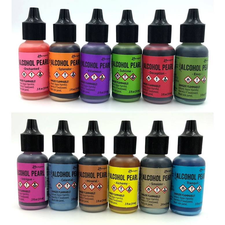 Tim Holtz® Alcohol Pearls are permanent, fast drying, pigment and dye inks formulated to create pearlescent colorful effects. Use with Tim Holtz® Alcohol Inks and Alcohol Ink Blending Solution to achieve luminous layers on YUPO®, Alcohol Ink Cardstock, Alcohol Ink Surfaces, and other non-porous surfaces.