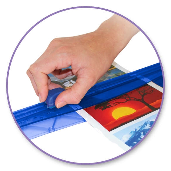 3- Secure the paper with one hand, and silde down the cutter blade to cut through the paper with the other hand. For best result on heavier paper cardstock, slide blade up and down a few times.