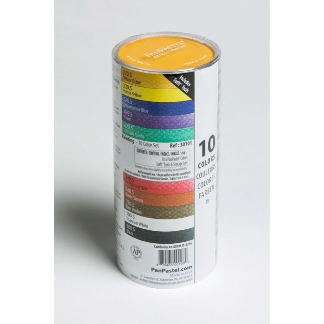 10 colours : 270.5 Yellow Ochre, 220.5 Hansa Yellow, 520.5 Ultramarine Blue, 470.5 Violet, 620.5 Phthalo Green, 340.5 Permanent Red, 740.5 Burnt Sienna, 780.5 Raw Umber, 100.5 Titanium White and 800.5 Black