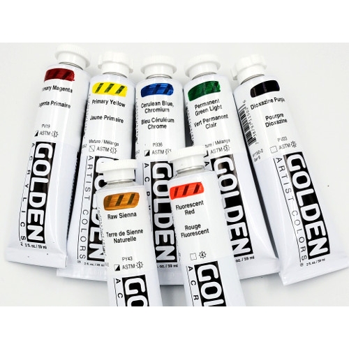 La première gamme de couleurs acryliques GOLDEN est réputée pour sa consistance exceptionnellement lisse et épaisse. Elle rassemble le plus grand assortiment de pigments purs et uniques sous forme d'émulsion à 100% acrylique mis à la disposition des artistes professionnels. Ces couleurs offrent une permanence et une résistance à la lumière excellentes. Aucun opacifiant, agent de matage, additif de texture ou colorant n'ont été ajoutés.