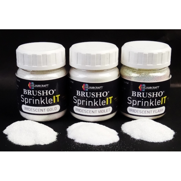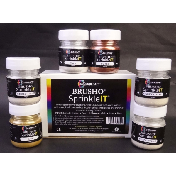 Add a new dimension to working with Brusho® Crystal Colour using Brusho® SprinkleIT® ? New SprinkleIT® - Brusho® that sparkles and shimmers! ? Simply sprinkle it over Brusho® Crystal Colour and then, once spritzed with water, it will create amazing e?ects ? Ideal for use on canvases, greeting cards, gift tags, scrapbooking, mixed media projects, interior design/home décor ? Use SprinkleIT® over black card or paper on its own ? spritz with water for stand alone e?ects.