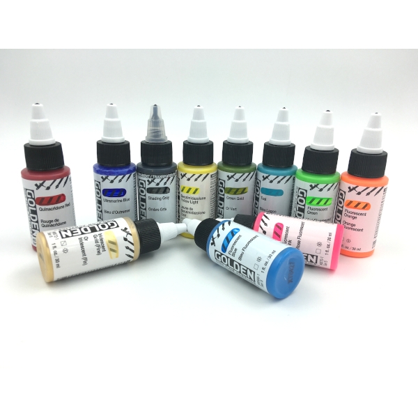 Introduced as a replacement for GOLDEN Airbrush Colors in July of 2013, High Flow offers increased durability of dry paint and a larger palette of colors including Iridescent and Fluorescent colors, and more single-pigment colors that match the other GOLDEN color lines.