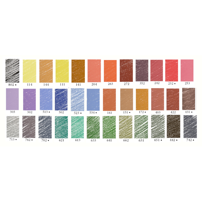 36 colours and wooden case : 802, 114, 144, 111, 141, 204, 263, 272, 352, 242, 232, 253, 303, 302, 513, 502, 523, 534, 161, 151, 172, 403, 422, 431, 713, 762, 702, 621, 613, 633, 641, 662, 631, 651, 442 and 742.