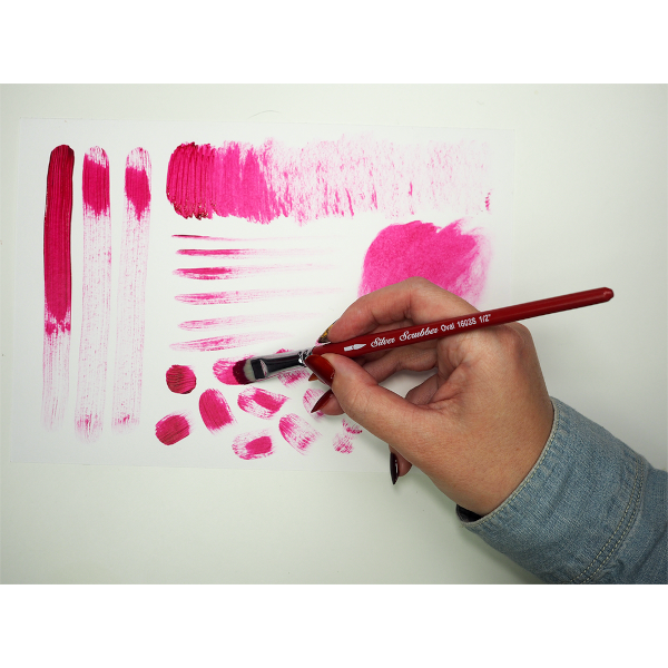 Silver Scrubbers are good for any type of paint and on any surface including canvas, boards, wood, thick paper, fabric, furniture, walls and more. These super stiff brushes can lift watercolor with ease, blend acrylic and oil, soften pastel or charcoal and firmly push paint into fabrics.