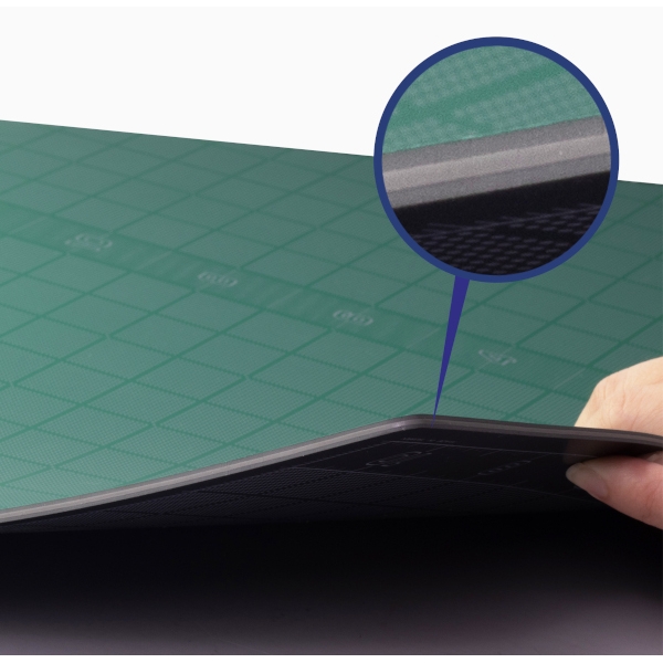 True 3-ply vinyl supports the resiliency of this cutting mat. Double sided usability doubling the the life of the mat. Self-healing combined with good care extends the usability.