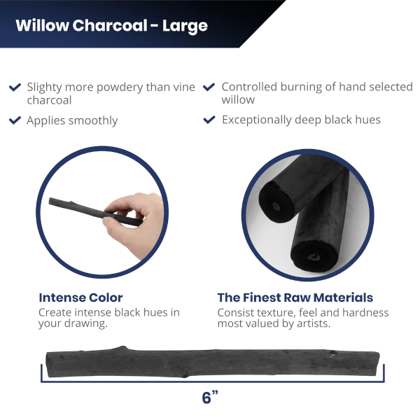Willow Charcoal is made in the traditional fashion: the controlled burning of willow sticks that are selected by hand. Slightly more powdery than vine charcoal, willow charcoal yields deep black hues and applies smoothly.