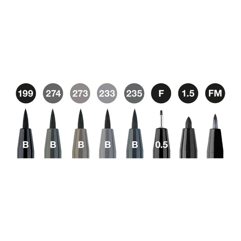 Contents: B = brush tip colors 199, 273, 274, 233, 235, F = 0.5 mm color 199, 1.5 mm color 199, Fude medium color 199