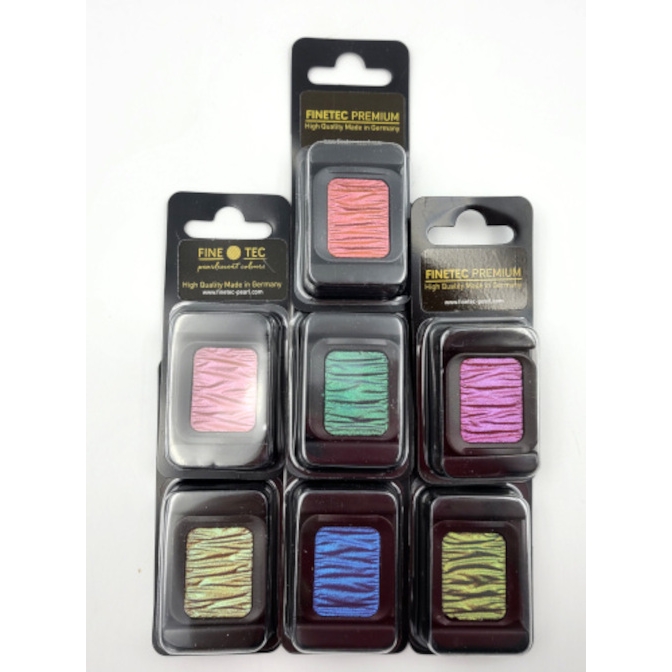 The FINETEC pearlescent colours are high-quality, water-soluble artist colours ? "Made in Germany". Our paints are manufactured in Emskirchen on the basis of selected raw materials of the highest quality and with a lot of handwork. Because of the special manufacturing process each colour cake gets its characteristic and individual wavy surface. Based on their high light fastness and strong pigmentation the FINETEC pearlescent colours are not only suitable for calligraphy and painting, but also for graphic art and many more. There are no limitations imposed on your imagination and creativity. The colours can be used with brushes, classic nibs as well as glass nibs. They can be mixed with each other as well as with other media and adhere to the various kinds of absorbent surfaces. These include wood and stone as well as different types of paper (e. g. watercolour paper). Our colour formula, which we developed together with artists and calligraphers, has a very good solubility.