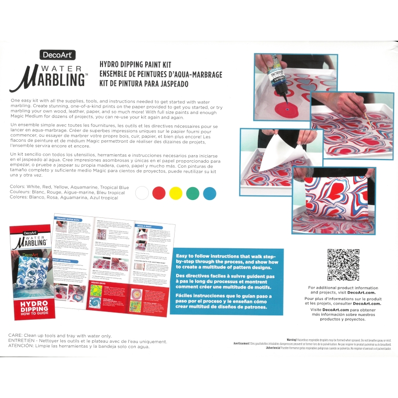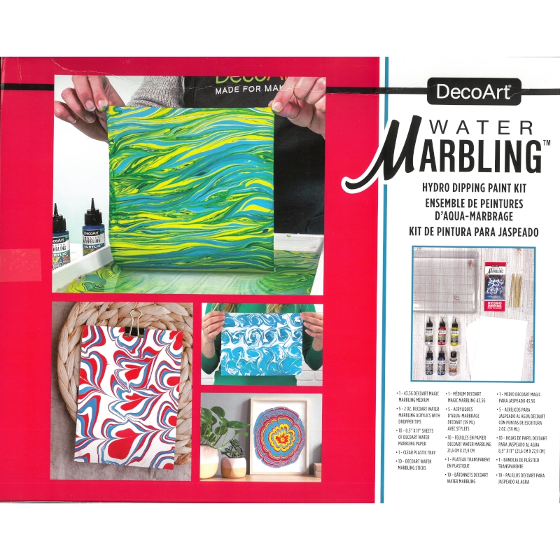 Includes : 1x Magic Marbling Medium, 5x DecoArt Water Marbling Acrylics 2oz, 10x Water Marbling paper 8.5"x11", 1x Clear plastic tray and 10x Water marbling sticks