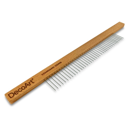 This fine toothed comb is 11.5" long and features stainless-steel teeth evenly spaced 1/4" apart. The solid wood handle is designed to overhang and rest on the edges of the DecoArt Water Marbling Tray. This promotes stability and ease when creating beautiful water marbling patterns. Create stunning gelgit patterns or enchanting arches with this water marbling comb.
