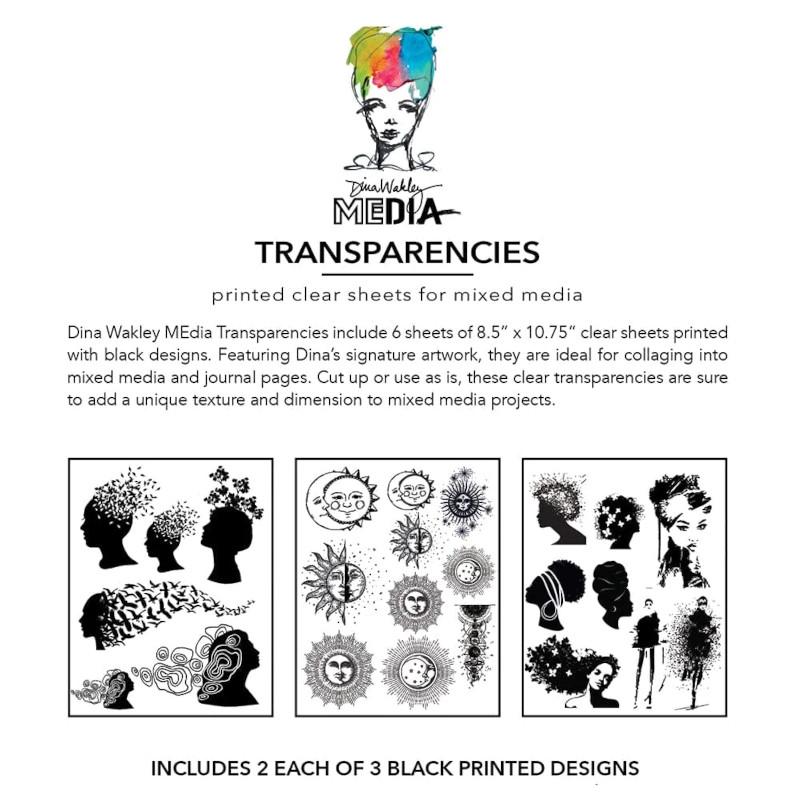 Dina Wakley MEdia Transparencies include 6 sheets of 8.5 x 10.75" (21.59cm x 27.3cm) clear sheets printed with black designs. Featuring Dina's signature artwork, they are ideal for collaging into mixed media and journal pages. Cut up or use as is, these clear transparencies are sure to add unique texture and dimension to mixed media pages.