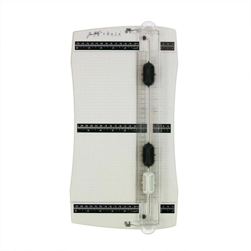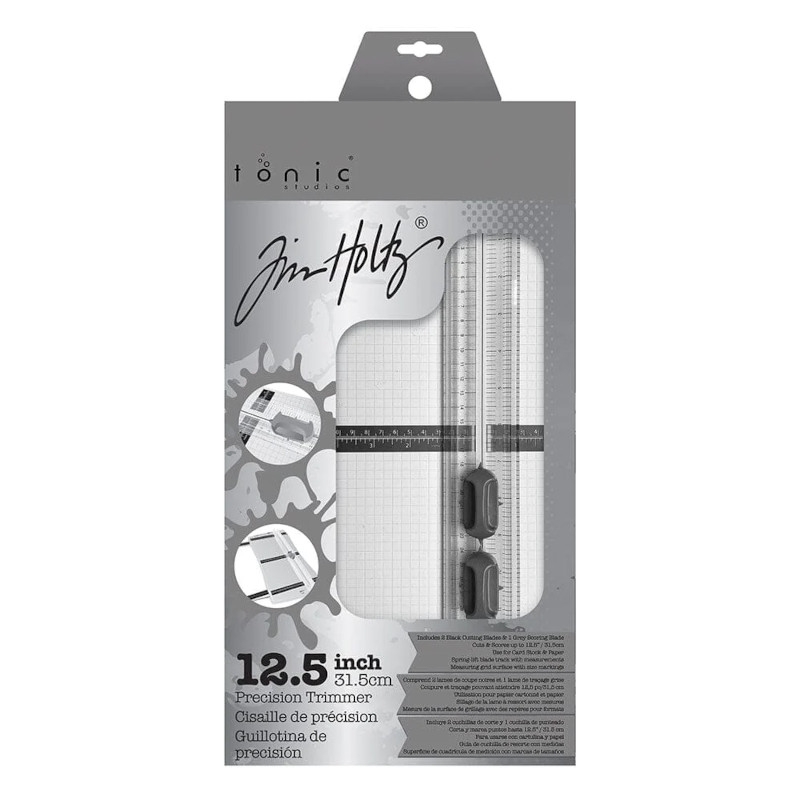Includes 2 Black cutting blades & 1 grey scoring blade. Cut & Scores up to 12.5" (31.5cm). Use for card stock & paper. Spring-lift blade track with measurements. Measuring grid surface with size markings.