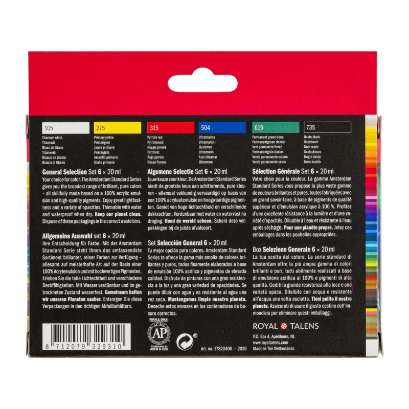 Contents: 6 x 20 ml tubes (105 Titanium White, 275 Primary Yellow, 315 Pyrrole Red, 504 Ultramarine, 619 Permanent Green Deep, 735 Oxide Black).
