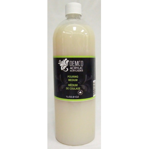 DEMCO EnCouleurs pouring medium is permanent and waterproof once dry. Mixed with fluid acrylic colors or colored inks, it produces a colored, homogeneous and smooth film. Pouring medium gives relief and shine to flat surfaces and helps create a droplet effect when applied sparingly. It retains a high gloss and a wet appearance when dry. Can be used directly from the bottle without adding color for a thick varnish effect. In its pure state, the pouring medium will have a milky effect but will become completely clear and shiny when dry.