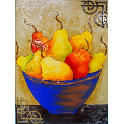 Acrylique, vitrail, porcelaine et pâte sur toile en bois avec contour arrondi 18"x24". Par Brigitte Malenfant.