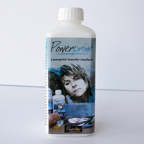 Transfers images printed from a laser printer or laser photocopier to canvas paper, carton, fabric, ceramic, metal and Powertex treated surfaces. The surface should be a light colour and perfectly dry. Any photo will come out as a Mirror image, so you need a reversed version of the image. With a brush, paint a layer of Powerprint (the same thickness) on canvas or another object, and a layer of Powerprint onto the image side of the laserprint. Turn the image over, on the surface and press down very firmly using a roller or a dry sponge. Dry the image with a hair dryer for 10 minutes and let it cool. Then, with a damp sponge, remove the paper layer. Finish your work of art with other prints or acrylics.