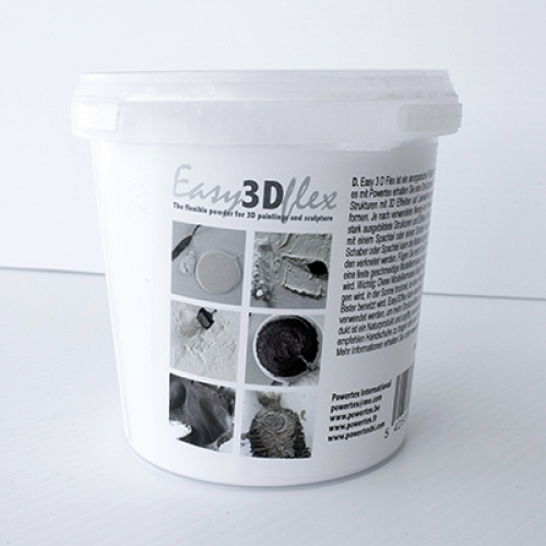 Easy3Dflex is an inorganic filling compound which comes as a powder. Mixed with Powertex, you can use it to make thick and coarse textures and even achieve 3D effects in paintings and sculptures. Easy3Dflex and Powertex need to be mixed with a scraper or palette knife and can be applied with a brush, scraper/palette knife or sculpted by hand. Adding more and more of the white Easy3Dflex powder will result in a thick sculpting clay that dries to the air and gets rock hard. Important: This medium will show cracks when applied in very thick layers, by drying in the sun or close to a heat source or by adding water or bister to the surface. These cracks will work to your advantage and give a very decorative result. However, cracks can be avoided by applying the product in thin layers with enough drying time in between, or by adding a little bit of white sand.The thick sculpting paste can be used to press very detailed prints into the surface like rope, screws, buttons, stencils, ... This way you can get the most amazing effects. Easy3Dflex can also be used to thicken acrylic paints to achieve more textured effects in paintings. This product is natural and non toxic, but can dry out the skin. We recommend wearing gloves or using hand cream.