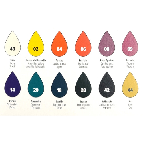 Porcelaine 150 exploration set - gloss 12 x 20 ml #1 : ivory, Marseille yellow, agate orange, scarlet, opaline pink, fuchsia, parma, turquoise blue, sapphire, bronze, anthracite black, gold. Water base for creation on porcelain objects (art of the table).