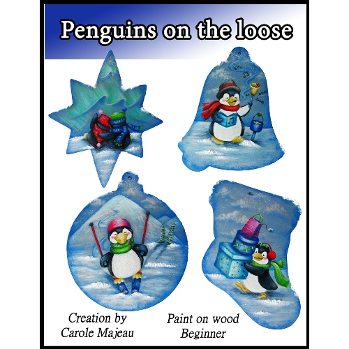 Pattern of acrylic on wood using 4 wood pièces of 9" high : Christmas stocking, Bethlehem Star, Bell and round Christmas ball. Beginner level. By Carole Majeau.